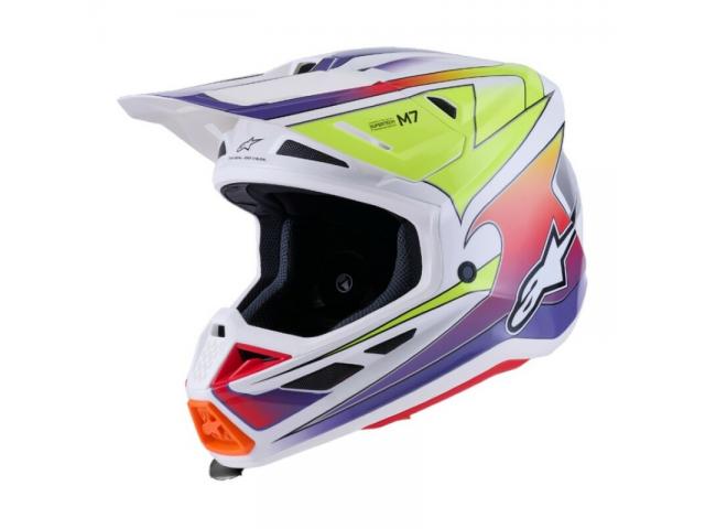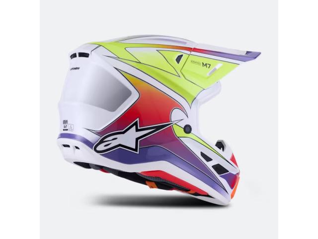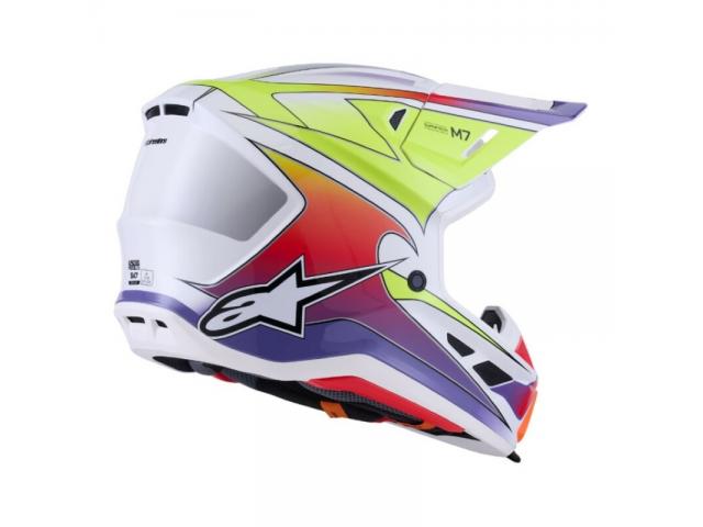 Il casco S-M7 è progettato per le gare off-road ed è ottimizzato per offrire la perfetta combinazione di ventilazione superiore e comfort in un casco leggero, mentre la sua calotta composita estremamente aerodinamica offre una protezione eccezionale dagli impatti. Oltre ai sistemi brevettati Alpinestars A-Head Fitment e Visor Detaching, l'S-M7 è dotato di tecnologia innovativa PLASMA sul bordo inferiore della calotta per una dissipazione ottimale dell'energia in caso di contatto con l'area della clavicola.